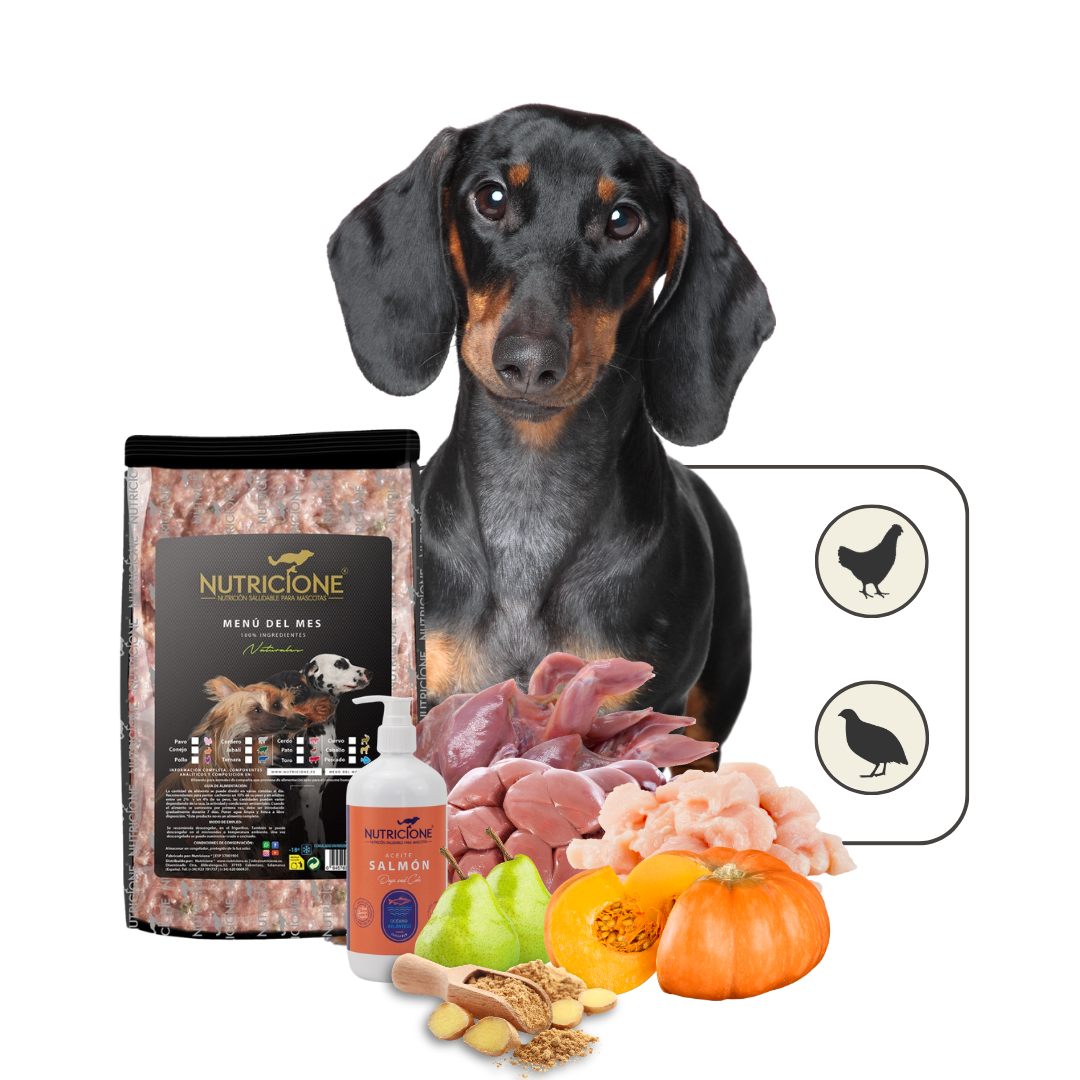 Carne de pollo, Perdiz entera (con hueso), Hígado de pollo, Pera, Calabaza, Aceite de Salmón y Jengibre